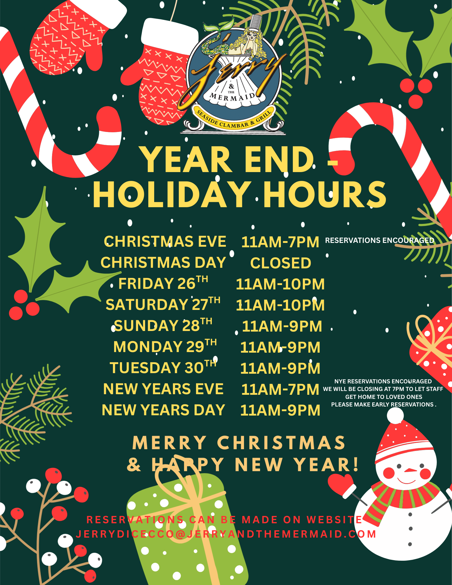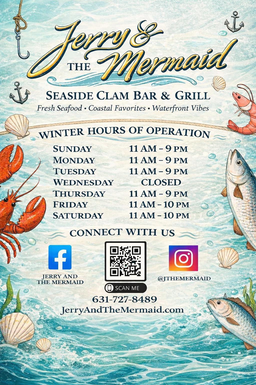 🐚 JERRY & THE MERMAID Seaside Clam Bar & Grill Fresh Seafood • Coastal Favorites • Waterfront Vibes • Vegan & GF Friendly • Marinated Steaks & Burgers • Delicious Salads • Homemade Desserts • All Star Staff • 32 Years Same Family Owned & Operated ⏰ HOURS OF OPERATION Sunday 11 AM – 9 PM Monday 11 AM – 9 PM Tuesday 11 AM – 9 PM Wednesday CLOSED Thursday 11 AM – 9 PM Friday 11 AM – 10 PM Saturday 11 AM – 10 PM 📍 CONNECT WITH US 📞 631-727-8489 🌐 JerryAndTheMermaid.com 📘 Facebook: Jerry and the Mermaid 📸 Instagram: @jthemermaid